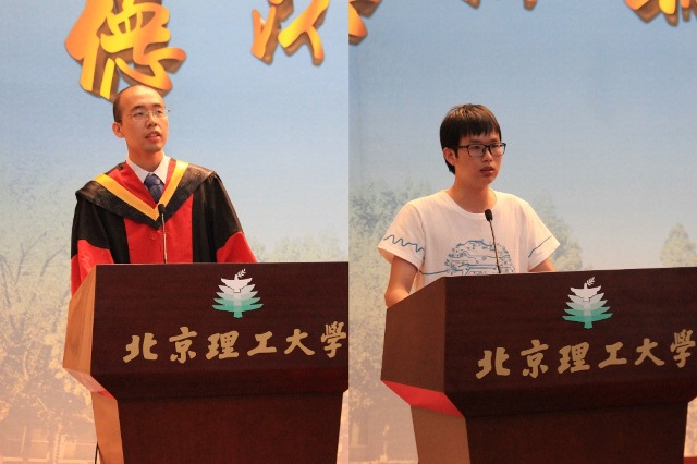 优秀研究生代表杨大鹏同学代表全体毕业研究生发言。他首先代表同学们向父母、师长的支持与教诲表达了衷心的感谢。杨大鹏同学表示,十年北理情,获益似海深。严谨的校风、师长的教导,他都铭记在心。最后代表全体毕业生表达了对母校和老师们的祝福。2015届优秀本科毕业生代表陈孙杰同学在发言中表示,大学毕业既是终点更是起点,作为当代热血青年,无论走上工作岗位还是继续深造,他们都将以最饱满的热情去勇敢地面对各种挑战,奋发图强,用智慧和汗水为中国梦添砖加瓦。