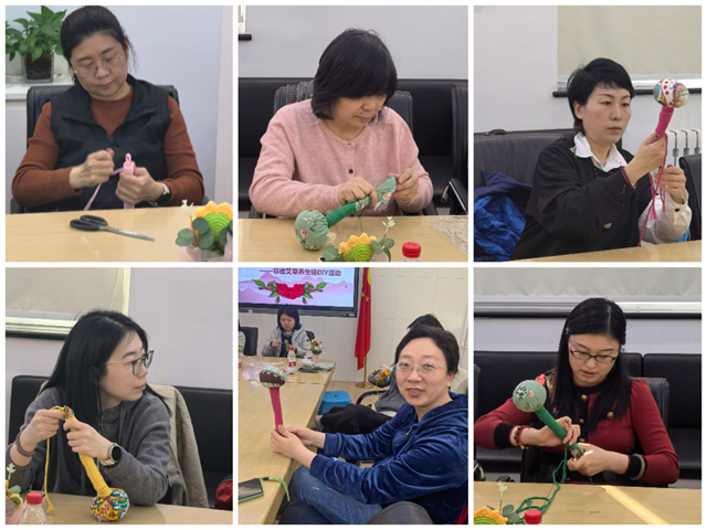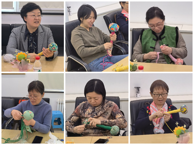 活动开始后,女教职工们认真学习制作技巧,从固定木柄、用棉布包裹定型、到以彩色棉线缠绕固定,再到最后艾草锤制作成型,每一步都充满了趣味与挑战。活动现场气氛热烈,经过接近一小时精心制作,一个个形似“鼓槌”、兼具实用与美感的艾草养生锤陆续完成。参与活动的老师纷纷表示,亲手制作养生锤不仅能体验到非遗文化的魅力,也感受到学院工会对女教职工的关心关怀。