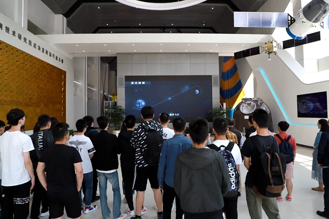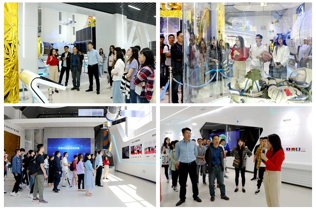 随后师生们跟随工作人员共同参观了导航定位、通信广播、对地观测、空间科学与技术试验、深空探测、载人航天六大系列航天器模型和部分实物,近距离地看到了媒体报道中的人造卫星、发射器、地面站系统等。一张张图片、一件件模型与实物,展示了航空技术在卫星通信传输、气象服务、农业育种等领域的广泛应用。尽管短时间内很难全面了解专业高精设备中的奥秘,但师生们真切体会了航天技术的复杂与精细,震撼、惊叹于我国航天事业的重大科技成就,为祖国倍感自豪。